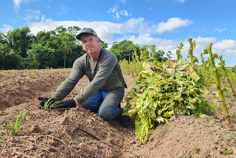O tabaco ainda não está todo colhido, mas o ciclo na agricultura segue adiante. Na foto acima, pode-se ver, à direita, ainda uma parcela de nossas folhas por serem retiradas, enquanto mostro à minha frente uma mudinha de milho, que já foi plantado na resteva, na área onde colhemos todo o tabaco. Além do milho, também já temos feijão plantado na resteva, grãos que servirão para a nossa subsistência, para alimentar nossa família. Esse é o modelo da agricultura familiar em toda a região, com diversificação constante.