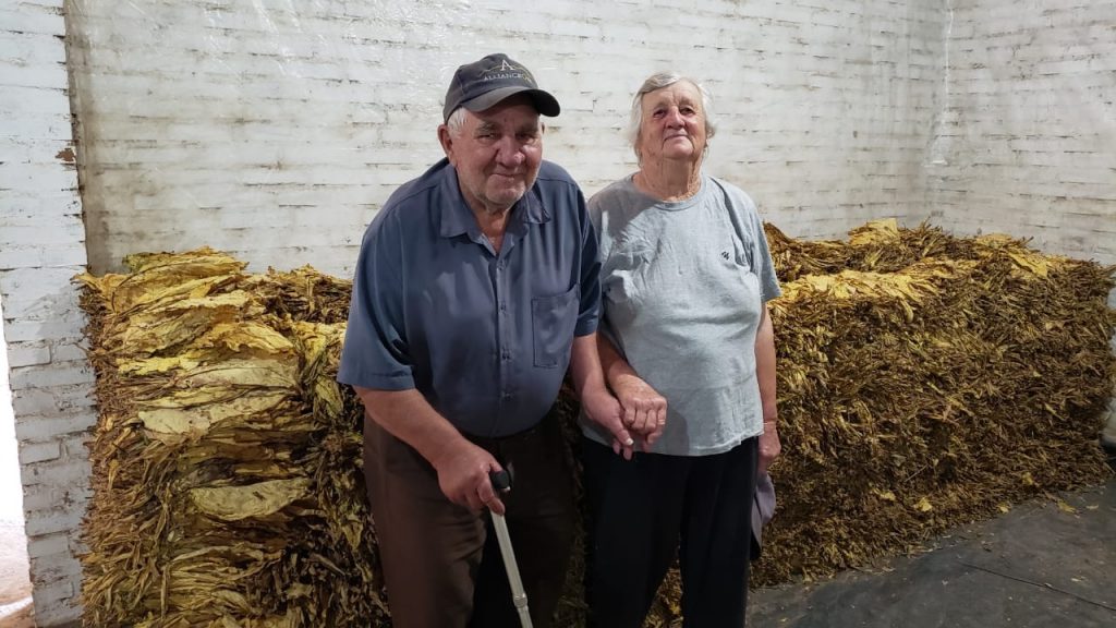 Na semana passada fomos conhecer uma propriedade diferenciada que se dedica ao tabaco há 45 anos. Ela fica em São Lourenço do Sul e pertence à família Hübner. Na verdade, são três gerações que se ocupam dos cuidados com as plantações. Udo, de 86 anos, e Almida Iutz Hübner, 80 (ambos na foto acima), naturalmente já são aposentados, mas ainda auxiliam em algumas tarefas. Eles se casaram em 30 de maio de 1959, e já na safra 1975/76 plantaram tabaco pela primeira vez. Nestes 61 anos de casados, sempre moraram na mesma propriedade e o tabaco praticamente lhes permitiu adquirir tudo o que hoje possuem.