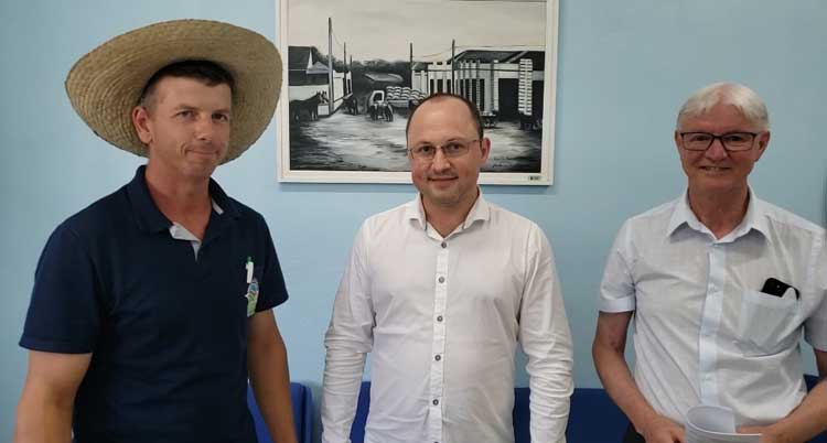 Na viagem rumo ao Paraná, deixamos Santa Cruz do Sul ontem bem cedo, e às 15 horas já estávamos em Rio Azul (PR). Tenho a alegria de fazer a viagem na companhia do presidente da Associação dos Fumicultores do Brasil (Afubra), Benício Albano Werner, que aproveitou a passagem por essa cidade para se encontrar com o prefeito local, Rodrigo Skalicz Solda, atualmente o presidente da Associação dos Municípios Produtores de Tabaco (Amprotabaco). Rio Azul, de 15 mil habitantes, é o segundo maior produtor de tabaco no Paraná, e o 12o na região Sul. Do orçamento de R$ 52 milhões, mais da metade vem do tabaco. Benício hoje também me acompanha na visita a Guamiranga. Abaixo, um registro de nosso encontro com o prefeito Solda (no centro).