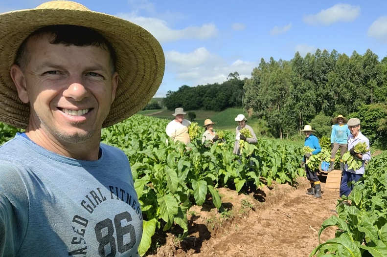Olá, pessoal! Tudo bem? Esta semana começou com o tempo bom, estável, e assim pudemos iniciar a colheita do tabaco. Nessa segunda-feira, 18, retiramos a baixeira nas lavouras dos meus pais, enchendo a estufa deles, que ainda é de tacos. Começamos a colher três semanas mais tarde em relação ao ano passado, mesmo tendo plantado na mesma época, o que evidencia o quanto o frio e o clima instável retardaram o desenvolvimento das plantas neste ano. Hoje, com a primeira fornada colhida, vamos nos dedicar a seguir no desponte das plantas, a retirada da flor, e amanhã o plano é colher a baixeira nas minhas lavouras e da minha esposa Louvane. Nesse caso, vamos encher a nossa estufa elétrica. Na foto abaixo, estamos na lida da colheita, ontem: eu, a Louvane, meus pais Rosa e Aloísio e ainda o Alan Toigo e nossos vizinhos Nestor Hentschke e Romeu Hister, que nos auxiliaram, para garantir mais mão de obra e finalizar no mesmo dia. Se tudo correr conforme o previsto, amanhã encheremos a nossa estufa, e na quinta vamos retomar a tarefa do desponte.