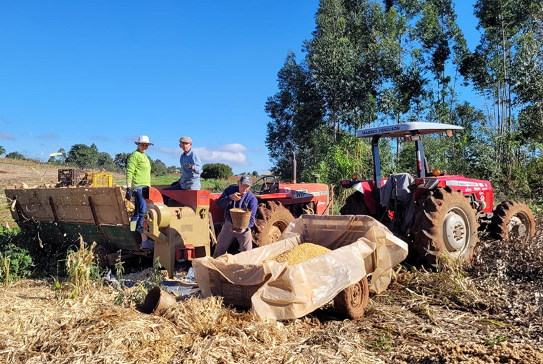 Olá, pessoal! Tudo bem? Nessa segunda-feira, 18, finalmente o sol reapareceu na região, depois de vários dias de chuva (intensa inclusive) e de muita umidade. Mesmo assim, a segunda ainda teve cerração e neblina até por volta das 11 horas. Depois, foi a hora de cuidar dos canteiros de mudas de tabaco, arejá-los e fazer os tratamentos químicos necessários para a época. As mudas já receberam a segunda poda e devem ter a terceira no final de semana ou no início da próxima. Com isso, estarão prontas para serem levadas à lavoura, o que deve acontecer entre o final deste mês e os primeiros dias de agosto. Até lá, a gente agiliza outras tarefas, como é o caso do milho que ainda não pode ser colhido. Eu, minha esposa Louvane, meu pai Aloísio e nosso vizinho Nestor Hentschke estamos envolvidos na debulha das espigas que haviam sido colhidas há alguns dias e, por causa da chuva, ainda haviam ficado guardadas no paiol, esperando pela melhora do tempo.