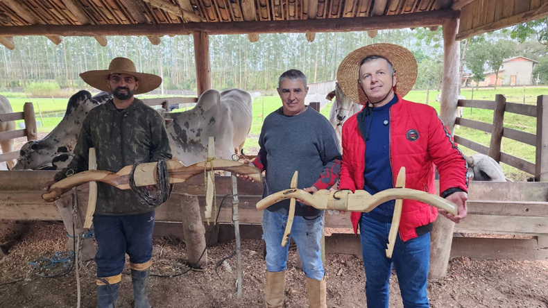 Já no último sábado, 6, eu e o Alan nos deslocamos de carro entre Santa Cruz do Sul e Florianópolis, em viagem que nos trouxe até Mato Grosso, onde nos encontramos ao longo desta semana participando do Road-Show MT, com jornalistas e influenciadores digitais das mais variadas regiões do Brasil. No caminho, no sábado, paramos em São João do Sul, próximo à divisa com o Rio Grande do Sul, no litoral, para conhecer a propriedade de Cassiano Raupp de Matos, que aparece comigo na foto acima, ao lado ainda de seu pai Volnei Floriano de Matos. Eles também plantam tabaco, mas em paralelo o Cassiano é conhecido em toda aquela região por fabricar cangas de boi, que mostramos na foto. Ainda que os produtores também adotem a mecanização, são muito comuns naquela região as carroças de duas rodas puxadas por uma junta de bois. Inclusive, quando estivemos por lá, no sábado, fizeram um desfile com cerca de 20 carroças, numa grande festa, com direito a churrasco, para nossa honra e alegria.