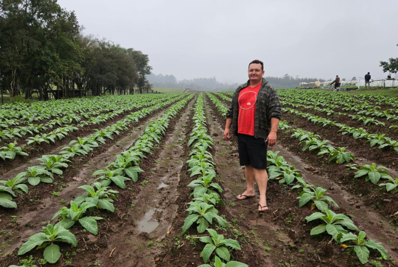 E na mesma localidade, na verdade a poucos metros da propriedade da família Adiers, me deparei com outra lavoura de tabaco, essa já com as plantas em adiantado estágio de desenvolvimento. Nesse caso, é a plantação do Cassandro Krainovic, de 43 anos. Pela primeira vez ele decidiu antecipar o plantio, e fez isso em abril. Transplantou 30 mil naquela ocasião e está muito satisfeito com o aspecto das plantas. Tão satisfeito que lamenta já não ter plantado todo o tabaco de forma antecipada. Seu plano é transplantar uma segunda leva em julho, que seria a época normal naquela região. Isso só evidencia que a cultura tem se adaptado cada vez mais a diferentes situações.