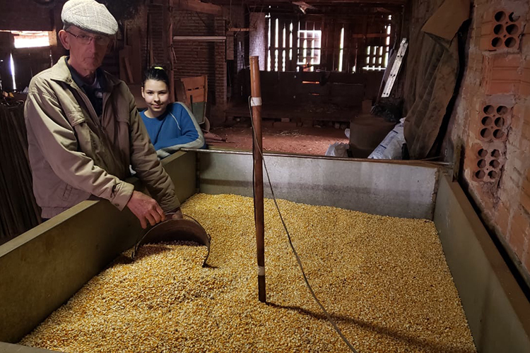 Olá, pessoal! Tudo bem? Nesta semana, em que o frio se manifesta em toda a região, acompanhado de ventos fortes, em nossa propriedade vamos agilizar as tarefas já visando aos preparativos para a nova safra. Na foto acima, meu pai, seu Aloísio, e minha filha, Giovana, estão junto ao secador de grãos, onde secamos o milho colhido em nossas lavouras, e que vai garantir alimento para os animais ao longo do ano, e até a venda de algum excedente. Esse secador, investimento importante na pequena propriedade para assegurar a armazenagem do cereal com qualidade, tem capacidade para 30 sacos. E o milho rendeu bem neste ano. No verão, em janeiro, houve preocupação com a estiagem, mas depois as chuvas vieram bem, e a colheita foi boa.