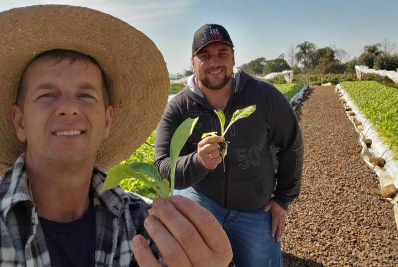 Na foto em destaque, estou junto aos nossos canteiros ao lado do meu colega de página Fumicultores do Brasil, o paranaense Anderson Rebinski, que nos visita nesta semana, em Santa Cruz, ao lado de sua esposa Ingrid. Além de mim e do Anderson, a página é integrada ainda pelo catarinense Alan Toigo, natural de Água Doce e hoje radicado em Santa Cruz. Anderson e Ingrid moram em Ivaí, onde também produzem tabaco. Na foto se pode ver como as mudas estão fortes, já plenamente desenvolvidas.