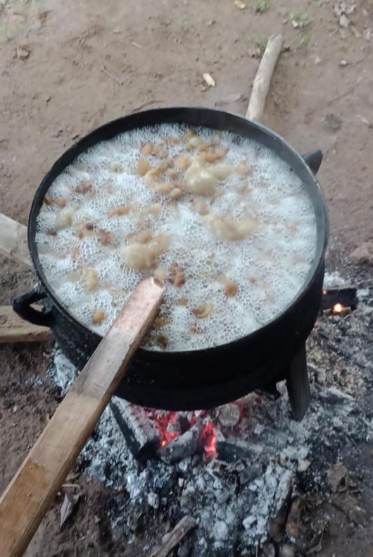 Enquanto estivemos em viagem pelo Mato Grosso, aqui em casa os meus pais, seu Aloísio e dona Rosa, aproveitaram a entressafra, período do inverno, para carnear um porquinho. É o que faz a maioria dos produtores nesta época, com a carneação de suínos, gado ou aves, a fim de garantir o alimento para subsistência ao longo dos dias de retomada das tarefas nas lavouras, na primavera. Na foto abaixo está o tacho com os torresmos sendo fritados, cozidos na banha. Aproveitamos ao máximo todos os itens do animal na alimentação familiar. E esse cozimento do torresmo ainda garante a banha de porco, que voltou a ser muito valorizada nos últimos anos, trazendo alguma renda com a venda do excedente.