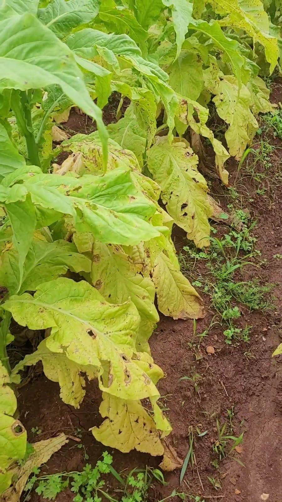 Desde ontem, estamos envolvidos novamente na colheita do tabaco, que deve seguir até amanhã ao meio-dia. O plano é encher duas estufas, das de tacos. Na semana passada, no intervalo entre as chuvas, conseguimos encher a de grampos. Como se pode ver pela foto acima, as plantas já revelam que se esgotou a reserva de nutrientes. Com o excesso de chuvas, as folhas simplesmente se entregam, e já na segunda apanha é preciso tirar muito mais folhas do que seria o normal. E nem adianta querer atropelar na colheita, pois a capacidade das estufas é limitada. Se encher demais, além da perda na qualidade, ainda há o risco de perder a própria unidade de cura.