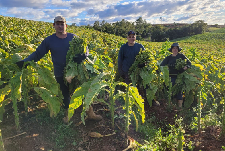 Olá, pessoal! Tudo bem? Começamos esta semana com friozinho, mas com sol. Na semana passada, o acumulado da chuva chegou a 60 mm aqui em nossa propriedade. E a noite de sexta-feira foi de vento muito forte, que causou muitos estragos nas lavouras, em especial com a quebra de folhas do tabaco, ventania que ainda perdurou em parte do sábado. Estávamos fazendo desponte das flores e aplicando antibrotante, e a tarefa fica muito dificultada com vento. No domingo, o tempo melhorou, e então foi a vez de muitos produtores irem às lavouras, tanto para colher tabaco quanto para seguir nas demais tarefas. Nosso vizinho, seu Arsênio Dupont, inclusive aproveitou o dia para colher trigo, cuja safra foi bastante prejudicada pelo clima, em qualidade e em produtividade. Como ele comenta, sequer dará para recuperar o custo de produção.
