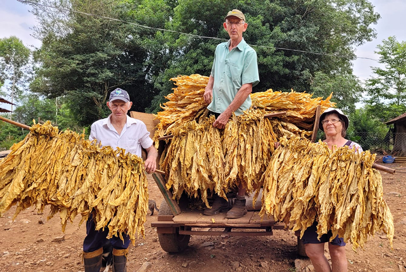 Olá, pessoal! Tudo bem? Esta é mais uma semana em que estamos com o olhar no horizonte e o ouvido atento à previsão do tempo, à espera da chuva. Em toda a região, a natureza está precisando muito de água. Aqui na propriedade, nós nos programamos para nesta terça-feira seguir na colheita do tabaco, mas aguardaremos com muito gosto se, como anuncia a meteorologia, vier a chuva. Nessa segunda aproveitamos para retirar da estufa o tabaco colhido mais recentemente por meus pais. Na foto acima, eles, seu Aloísio e dona Rosa, estão ao lado de nosso vizinho, seu Nestor Hentschke, que nos auxilia nas tarefas, justamente em meio à retirada das folhas já secas da unidade de cura, para armazená-las no galpão. Como se pode ver, a qualidade mais uma vez está excelente, e nos anima, porque é o tipo de produto que tende a ter uma boa aceitação na hora da comercialização.