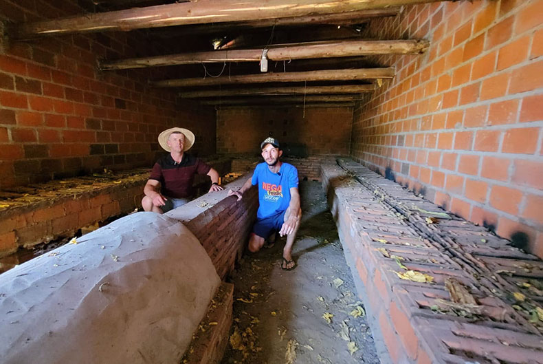 Na semana passada, eu e o Alan Toigo, meu colega da página Fumicultores do Brasil, visitamos Cerro Branco, onde fomos conhecer a propriedade de Mauro Couto, que aparece comigo na foto acima. O Mauro trabalhou por um tempo na cidade, e então decidiu investir as economias, ao lado da família, em uma propriedade rural. Além de cultivar tabaco, apostou em estufa de moranguinho. Atualmente, tem cerca de 7,8 mil pés, em três estufas, e cultiva milho. Em paralelo, plantam 90 mil pés de tabaco, que ainda secam em estufa de modelo antigo, com tacos, e até com canais de tijolo, cobertos com telhas e finalizados com barro. É algo bastante raro, em meio aos inúmeros modelos bem mais modernos largamente adotados. E no verão pretende plantar uns quatro hectares de soja na resteva do tabaco, tão logo conclua a colheita deste.