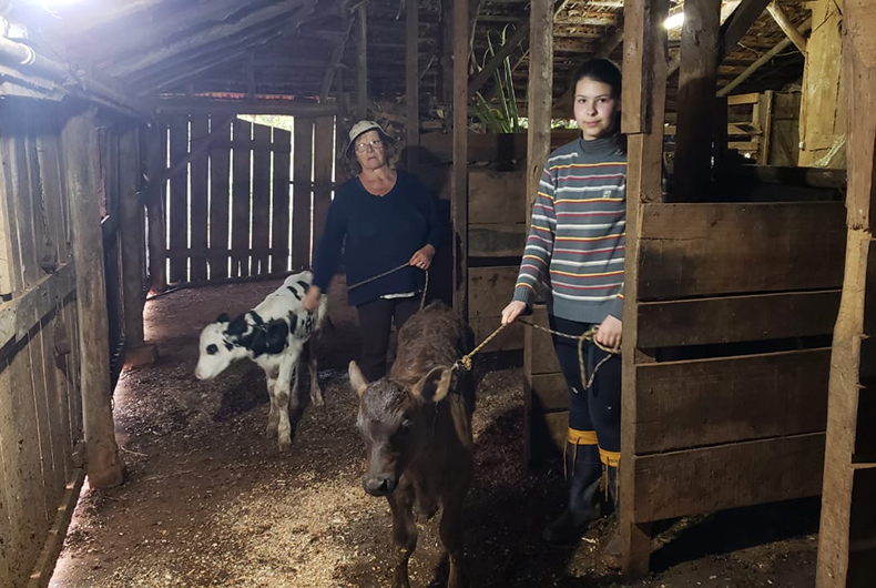 Em nossa propriedade, o milho já estava praticamente todo colhido, e assim escapamos de ter contratempos com essa cultura. Por sinal, foi uma safra muito boa, tanto na silagem quanto para grão, bem melhor do que a do ano passado, quando as plantas haviam sofrido com a estiagem. Utilizamos o milho para alimentar aves, que nos rendem carne e ovos; suínos, para consumo familiar; e igualmente para o gado. Temos nossos boizinhos e nossas vaquinhas; estas asseguram o leite para consumo tanto de minha família quanto para meus pais. E, claro, também para os terneiros. Na foto abaixo estão minha mãe, dona Rosa, e minha filha, Giovana, com os dois bezerrinhos. Garantir alimento de qualidade para a própria subsistência deve sempre ser um mandamento no meio rural.