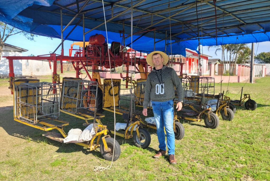 Essa máquina auxiliadora de colheita do tabaco, de marca Matilde, foi inspirada em um equipamento importado há mais de 40 anos. Na época, a máquina já era, de certa forma, ultrapassada na região de origem, mas por aqui, no Brasil, constituía uma novidade. Foi a partir daquele modelo original que um dos irmãos da família Francisco decidiu criar um protótipo nacional. Na propriedade dele, eles usam um modelo para sete pessoas sentadas, e assim conseguem encher três estufas elétricas por dia. Eu receberei a minha máquina, para três pessoas, nesta quinta-feira, 15. No futuro, ao usar o equipamento, detalharei essa experiência aqui na coluna.