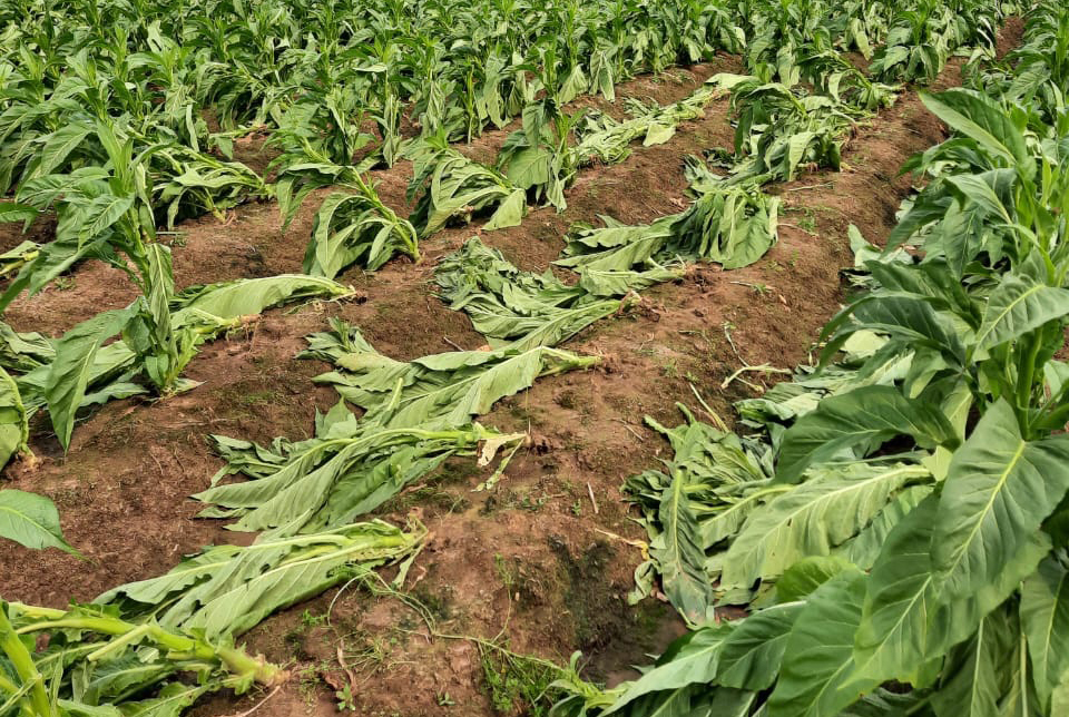 Mal haviam retirado a baixeira em lavoura de 40 mil pés, plantados em 20 de junho, e o vento e o granizo derrubaram, e até quebraram, muitas plantas. Essa plantação estava em vias de ter a retirada das flores, e agora precisa ser reerguida, até onde isso ainda é possível. Infelizmente, já não será mais uma safra normal, como poderia ter sido.