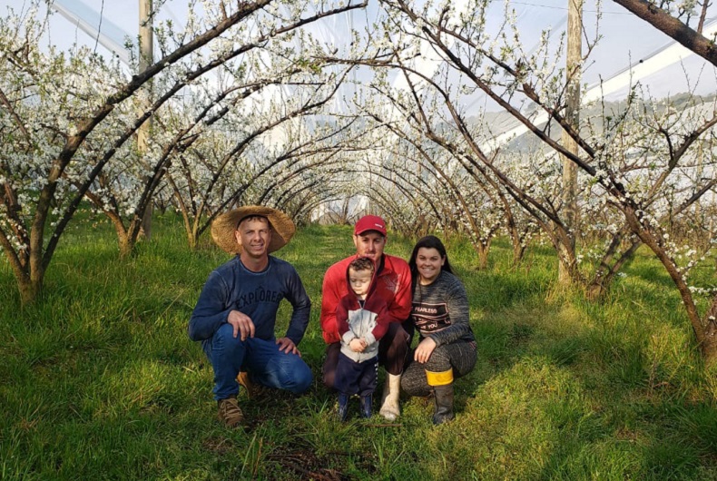Na primeira visita, conhecemos o Cristiano Palandi, 34 anos, e sua esposa Joseane Lima Palandi, 30, pais do pequeno Enzo Gabriel, de 2 anos. Eles possuem pomares de pêssego, caquis e ameixas; estas se encontravam em plena floração. Assim como aqui em nossa região o tabaco é a principal fonte de renda, eles obtêm a receita da fruticultura e, inclusive, fizeram um investimento forte em cobertura para a proteção das árvores contra intempéries. O custo dessa tela é de R$ 80 mil por hectare, com vida útil de 15 a 20 anos, desde que não seja danificada por ocorrência climática. No tabaco, claro, um item desses, atualmente, seria praticamente inviável devido ao custo.