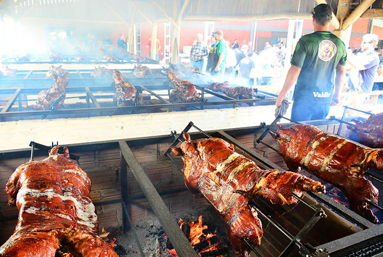 O relógio marcava 4 horas quando José Reus Fornari Grando e sua equipe – formada por outras sete pessoas – chegaram ao pavilhão da comunidade de Linha Nova, interior de Santa Cruz do Sul. A turma de voluntários tinha uma missão: preparar os porcos que seriam assados e servidos no 24º Festival Gaúcho do Porco no Rolete, realizado nesse domingo, 9.