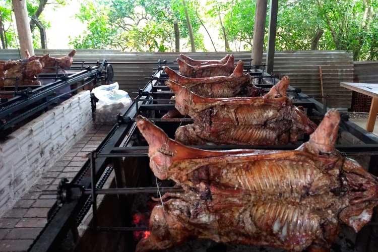 Pela ERS-418, a placa indica o berço de uma tradição deliciosa. É a localidade de Linha Nova. Um lugar que, há 20 anos, sedia o Festival Gaúcho do Porco no Rolete. Entre segredos e temperos, na madrugada deste domingo 30 assadores começaram a espetar 40 leitões, num total de mil quilos de carne. As churrasqueiras, no entanto, começaram a funcionar a partir das 5h30, com 800 quilos de carvão, conta um dos integrantes do time Paulo Zampieri.