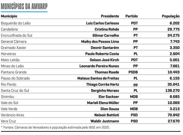A cada ano, as Câmaras de Vereadores renovam os integrantes das suas mesas diretoras. Em alguns casos, isso é resultado de acordos acertados no início das gestões; noutros, consequência da articulação dos parlamentares durante o mandato. O Partido Progressistas (PP) é destaque nos integrantes da Associação dos Municípios do Vale do Rio Pardo (Amvarp), com o maior número de presidências. Por outro lado, o PL administra Legislativos de municípios com mais população.
