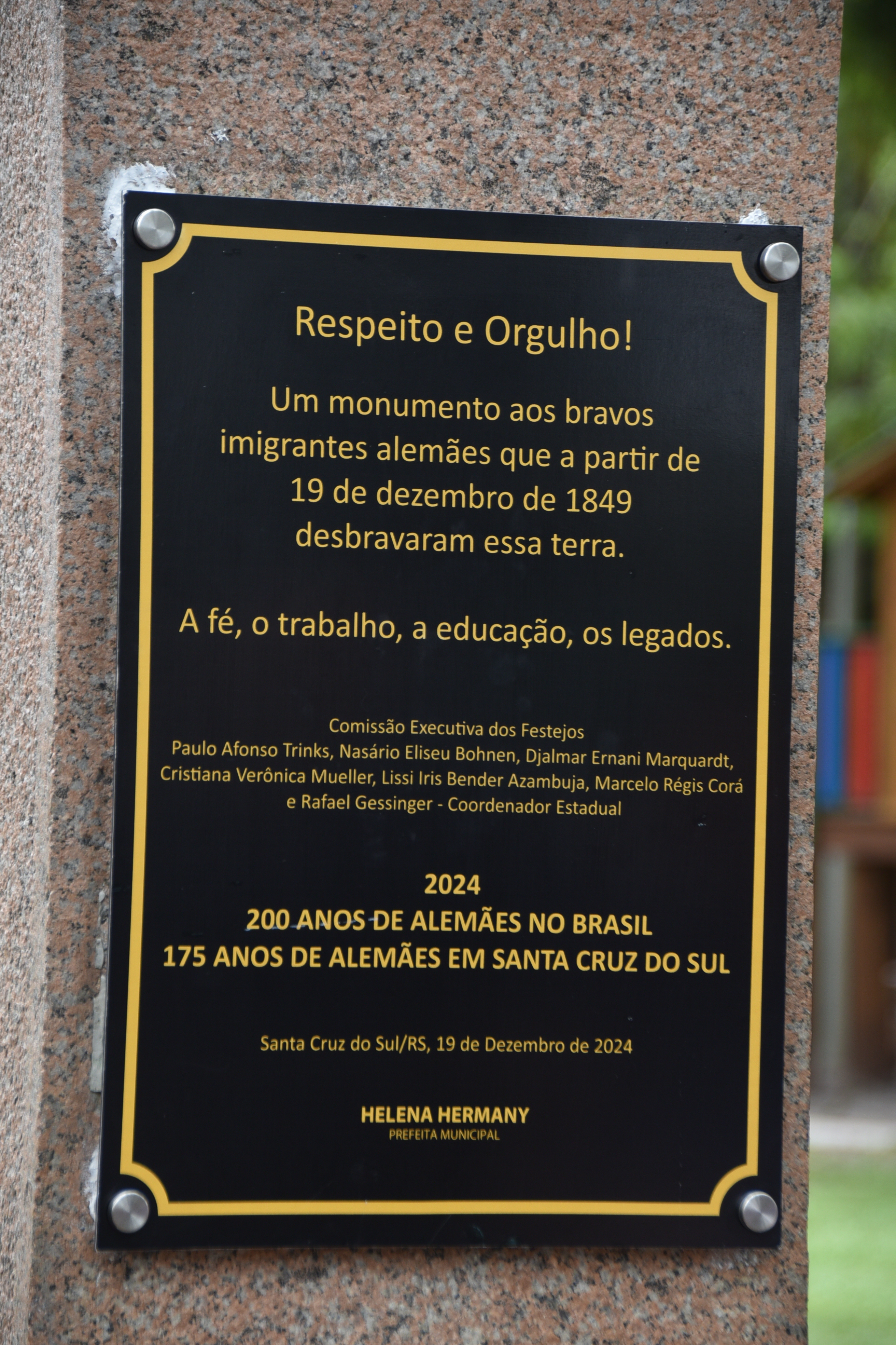 Santa Cruz do Sul encerrou nessa quinta-feira, 19, as celebrações pela chegada dos imigrantes alemães que se instalaram no município em 19 de dezembro de 1849. O fechamento ocorreu com a inauguração de um marco que celebra os 175 anos da imigração em Santa Cruz e os 200 anos no Rio Grande do Sul. A estrutura foi instalada junto à Praça da Bandeira e inaugurada por representantes da comissão executiva dos festejos e convidados.