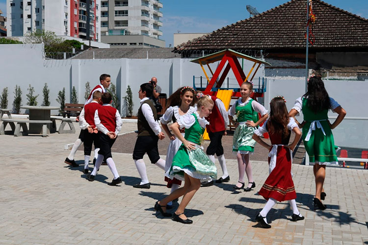 Sob sol forte, alunos da Escola Municipal Dona Leopoldina, inauguraram os bloquetes, com danças típicas alemãs. No Dia das Crianças e durante a Oktoberfest, o que se espera em um ato público municipal é uma homenagem à cultura alemã, feita pelos baixinhos.