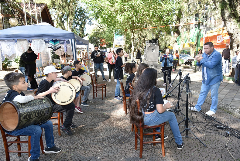 Fez sol, mas estava frio, e a pequena Lavínia, de 3 anos, vestiu um traje preto com mangas longas para passear pelo Centro com o pai na manhã do último sábado, 12, até chamar sua atenção o que ocorria na Praça Getúlio Vargas. “Ela me puxou pelo braço e quis parar para assistir às crianças tocando”, contou o empresário José Wesenik.