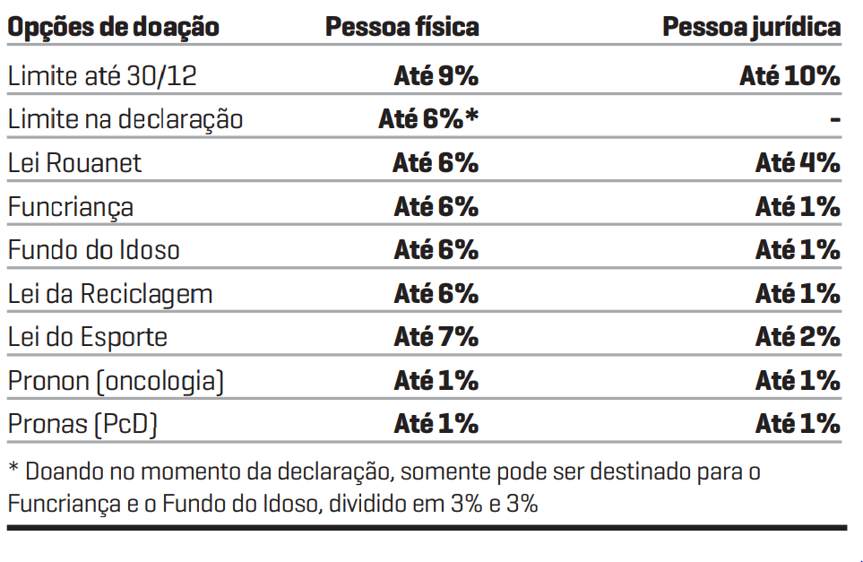 A consultora de projetos e captação de recursos, Vanessa Müller, explica que há regras para que essa doação seja feita. No caso do cidadão, só é válido para aqueles que adotam a modalidade completa de declaração. Ele pode chegar a 9%, sendo até 7% para a Lei do Esporte. Em alguns casos, como da Lei Rouanet, o índice fica em 6%.