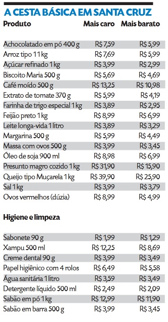 A lista com os 24 itens considerados essenciais no consumo das famílias santa-cruzenses voltou a ficar mais cara em novembro. Após um pequeno recuo no mês passado, puxado pela redução no preço de leite e derivados como o queijo, a cesta básica registrou novo aumento. Na comparação com o mês anterior, a alta é de 1,67%, ou R$ 3,03 a mais na conta.