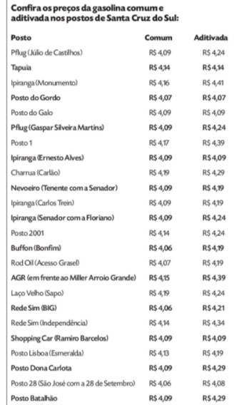 A gasolina aditivada mantém-se instável, a exemplo das pesquisas anteriores, variando de R$ 4,07 a R$ 4,39. A tendência, conforme os frentistas, é que nos próximos dias novas quedas ocorram. A variação acompanha a manifestação do promotor de Defesa Comunitária de Santa Cruz do Sul, Érico Barin, que em despacho expedido na tarde da última quinta-feira determinou que todos os postos de combustíveis do município reduzissem os preços aplicados nas bombas, tendo por parâmetros os postos de Lajeado, onde a média de valor é mais baixa que em Santa Cruz do Sul. A negativa, segundo o promotor, poderia caracterizar prática abusiva na relação de consumo.