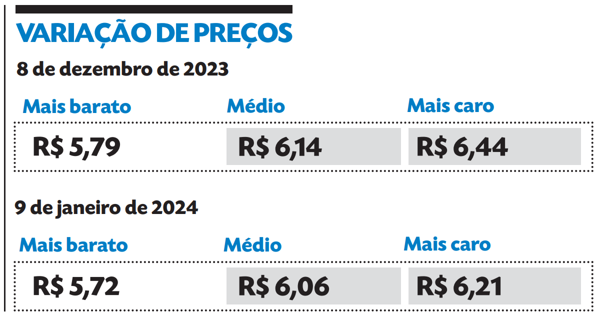 Conforme a pesquisa do Procon de Santa Cruz feita no dia 8 de dezembro de 2023, em 14 estabelecimentos do município, o diesel S-10 (comum) custava em média R$ 6,14 por litro. No dia 29 do mesmo mês, outro levantamento mostrou uma redução de R$ 0,20 no valor médio, que caiu para R$ 5,94. Após a virada do ano e o aumento dos impostos, o preço subiu R$ 0,10 e foi para R$ 6,04. Já no último estudo, divulgado nessa terça-feira, 9, a diferença foi de apenas R$ 0,02 e o combustível pode ser adquirido a R$ 6,06. Em um mês, a variação foi de 1,30%.