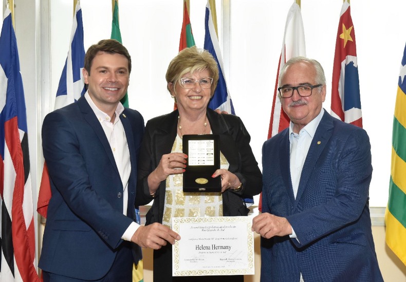 A prefeita de Santa Cruz do Sul, Helena Hermany, foi agraciada com a medalha da 55ª Legislatura da Assembleia Legislativa do Rio Grande do Sul. A entrega da homenagem, proposta pelo deputado estadual Marcus Vinícius (Progressistas), ocorreu na manhã desta quarta-feira, 20, no Salão Júlio de Castilhos, no parlamento gaúcho, em Porto Alegre.