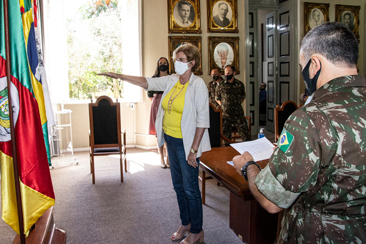 Com a mão estendida em direção ao pavilhão nacional, em um breve ato realizado no salão nobre do Palacinho, a prefeita de Santa Cruz do Sul, Helena Hermany, prestou juramento e foi empossada presidente da Junta de Serviço Militar (JSM) do município nesta quinta-feira, 11. Na sequência ela assinou o termo de posse, que prevê o cumprimento dos deveres relativos ao serviço militar.