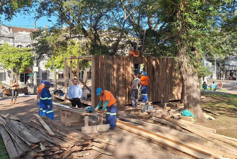 Quem passa pela Praça da Bandeira, em frente à Rua Marechal Floriano, percebe a movimentação de equipes da Prefeitura na construção de um galpão tradicionalista no Centro de Santa Cruz do Sul. Conforme apurado pelo Portal Gaz, a estrutura servirá como gabinete do prefeito Sérgio Moraes, que pretende atender o público e receber visitantes durante a Semana Farroupilha do município.