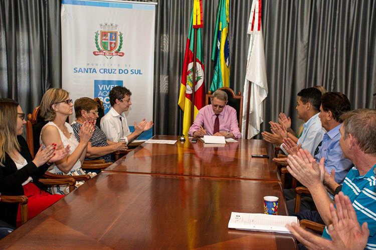 O primeiro plano de carreira do Estado, que trata a profissão de médico como carreira junto ao serviço público, foi sancionado pelo prefeito Telmo Kirst na tarde desta segunda-feira, dia 9, no salão nobre do Palacinho, com a presença de secretários, vereadores e profissionais da Saúde. A partir de agora, a fixação dos médicos no Sistema Único de Saúde (SUS) deve ser um diferencial no município, em razão das inúmeras alterações que passarão a vigorar.
