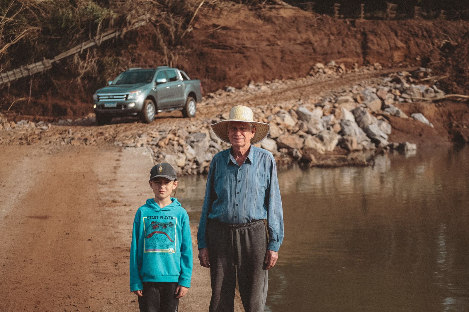 Derick com o avô, Eltor: Cabeceira da Ponte na Travessa Bauermann recebeu 40 cargas de rachão. Crédito: Agência Invista na Sua Imagem