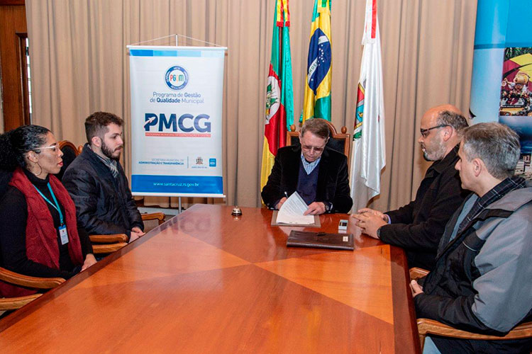 O prefeito Telmo Kirst assinou na tarde desta quarta-feira, 22, decreto instituindo o Programa Municipal de Capacitação e Gestão (PMCG) e definindo diretrizes para sua implantação. Com isso, a Prefeitura de Santa Cruz do Sul, através da Secretaria de Administração e Transparência (Seat), deverá manter um calendário permanente de capacitação para seus servidores. O lançamento deverá ocorrer no mês de setembro, quando está prevista também a segunda edição da Semana do Servidor.