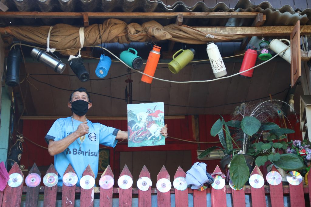 Anildo Luís da Silva tem 64 anos e está sem trabalho há um ano e meio. A alternativa foi catar material para reciclagem, separar e vender. Na casa humilde do Santa Vitória, ele exibe na sacada garrafas térmicas coloridas. As peças servem de decoração, mas viram moeda de troca para comprar comida para ele, a esposa e o filho caçula. “Eu vendo a R$ 5,00 cada uma. Uma nova custa R$ 30,00, mas a gente faz o negócio por R$ 5,00. Eu juntei com a reciclagem. Todas funcionam”, garantiu.