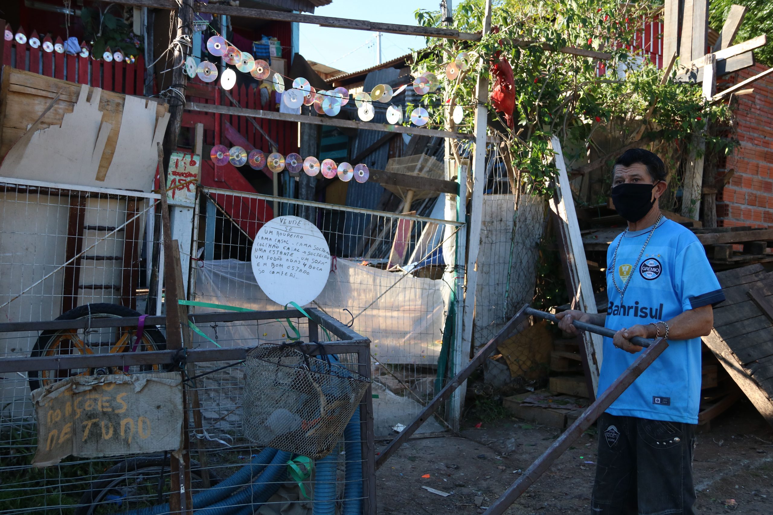Anildo Luís da Silva tem 64 anos e está sem trabalho há um ano e meio. A alternativa foi catar material para reciclagem, separar e vender. Na casa humilde do Santa Vitória, ele exibe na sacada garrafas térmicas coloridas. As peças servem de decoração, mas viram moeda de troca para comprar comida para ele, a esposa e o filho caçula. “Eu vendo a R$ 5,00 cada uma. Uma nova custa R$ 30,00, mas a gente faz o negócio por R$ 5,00. Eu juntei com a reciclagem. Todas funcionam”, garantiu.