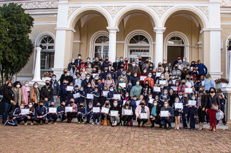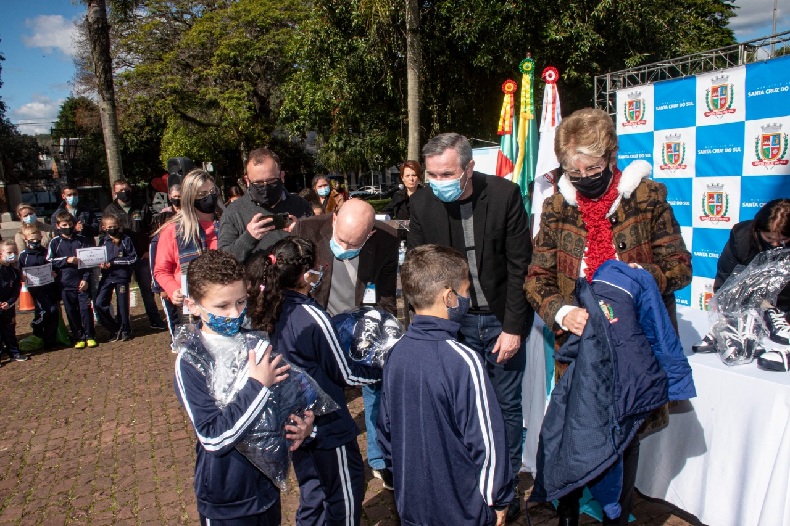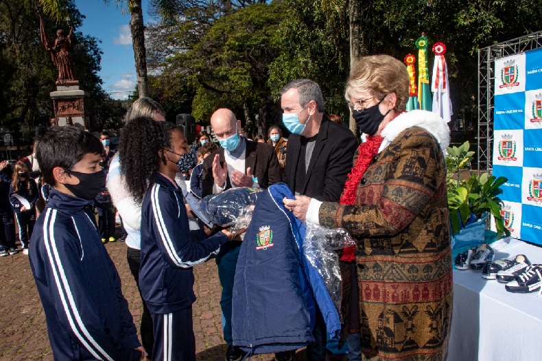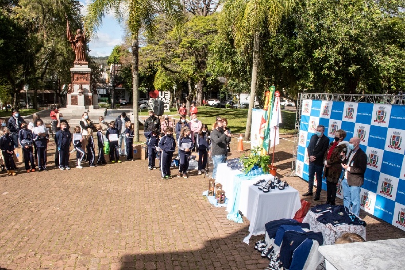 O Dia do Estudante, comemorado nesta quarta-feira, dia 11, foi especial para os estudantes da rede municipal de ensino. Em uma cerimônia realizada em frente ao Palacinho, na Praça da Bandeira, a prefeita Helena Hermany, junto com o secretário municipal de Educação, João Miguel Wenzel e o vice-prefeito Elstor Desbessell, fizeram a entrega simbólica de uniformes escolares – tênis e jaquetas – às representações das escolas municipais de ensino fundamental. Também participaram do ato, secretários, vereadores e membros do Conselho Municipal de Educação.