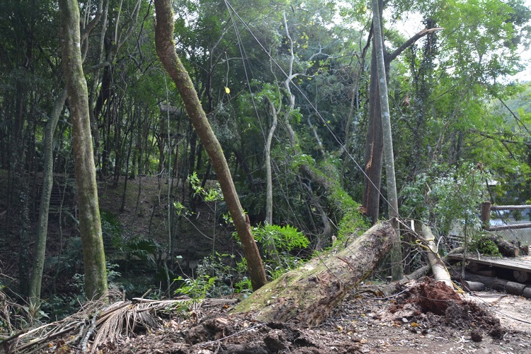 Na manhã desta terça-feira, 26, servidores da Central de Serviços trabalharam no corte de uma tipuana que caiu junto à entrada do parque, próximo ao lago, e atingiu a rede de telefonia. Após o corte e desobstrução da pista que dá acesso ao local, eles efetuaram a limpeza da área, com o transporte dos resíduos para o Parque de Eventos.
