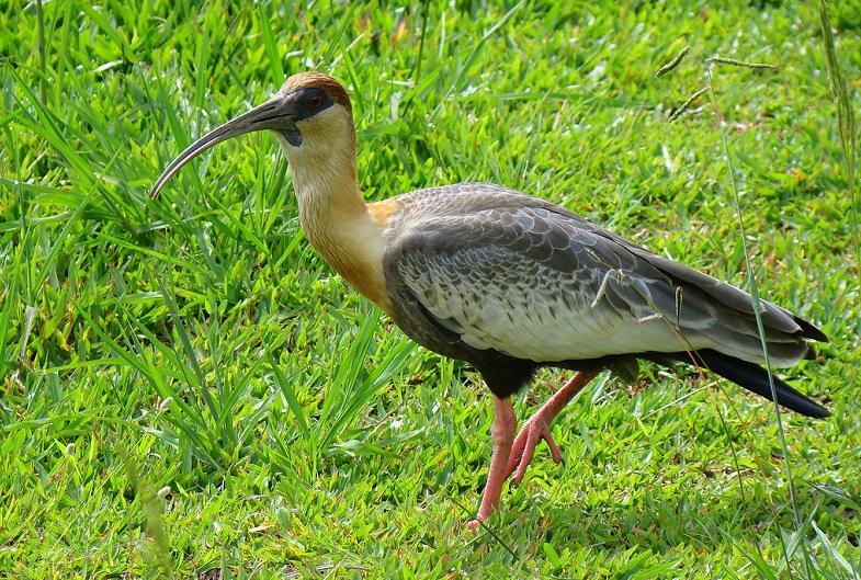 Essas aves medem cerca de 60 centímetros de comprimento e têm cerca de 40 centímetros de altura. Possuem um bico longo e curvo, pescoço esbranquiçado ou alaranjado e pernas avermelhadas. Têm alimentação variada, composta por artrópodes e outros invertebrados. Podem predar ainda pequenos lagartos, ratos, caramujos, anfíbios e pequenas serpentes, e, até, mesmo aves menores. Alimentam-se durante o dia e também ao pôr-do-sol.