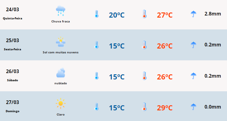 Pouca chuva é esperada apenas para esta quinta-feira, mas, se vier, será fraca. A temperatura, nos próximos dias, não passa dos 29 graus. Conforme projeta a MetSul Meteorologia, apenas o domingo deverá ter predomínio de sol – clima parecido com o registrado nesta quinta-feira pela estação da Gazeta Grupo de Comunicações, quando a temperatura mais alta do dia foi de 28,4 graus, às 15h50.