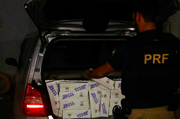 A PRF, através do setor de inteligência, abordou um veículo Nissan Livina suspeito de carregar cigarros. Dentro do veículo foram encontrados mais de 11 mil maços contrabandeados do Paraguai.