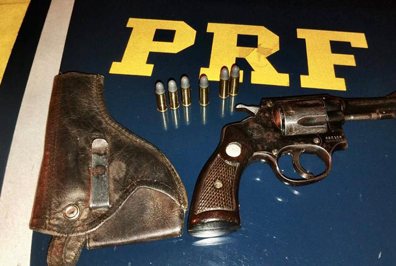 Os policiais realizavam fiscalização na rodovia quando deram ordem de parada ao motorista de uma Kombi escolar. O homem, de 57 anos, tinha ocorrências por ameaça e injúria. Durante as buscas, os policiais encontraram um revólver calibre 32 municiado e pronto para uso. O homem não tinha autorização para porte e nem o registro da arma.