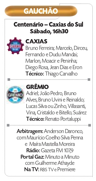 O técnico fez questão de descartar qualquer favoritismo gremista, ainda mais depois do susto levado na semifinal. “Aqui dentro não tem favoritismo. Pelo contrário. Os maiores exemplos que eu dou para meu grupo é o que está acontecendo no Brasil. A camisa não vai ganhar. São 11 contra 11. O Caxias tem todo o nosso respeito. O Caxias não chegou à toa. Eliminou nosso rival, e por méritos. É uma decisão de 180 minutos, 90 em Caxias, 90 na Arena. Todo cuidado é pouco”, disse Renato.