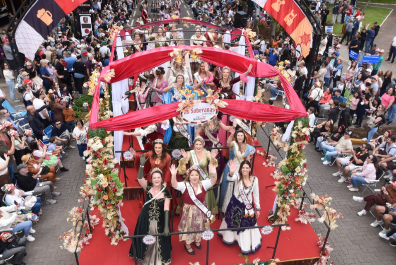 A rainha Rafaela Nicknig e as princesas Amanda Werner e Sofia Pretzel mostraram toda a sua simpatia no Carro 4 – “As Soberanas: a beleza que inspira o mundo”. A alegoria ainda trouxe representantes de cortes de outras edições. Um grupo de soberanas, com seus familiares, também desfilou na Rua Marechal Floriano. Em seguida, o Carro 5 – “Carro Lembranças: um marco de 40 anos” mergulhou na história da festa desde 1984 para celebrar as quatro décadas de alegria. A convivência entre as gerações foi evidenciada no Carro 6 – “A Família: alegria de geração em geração”.