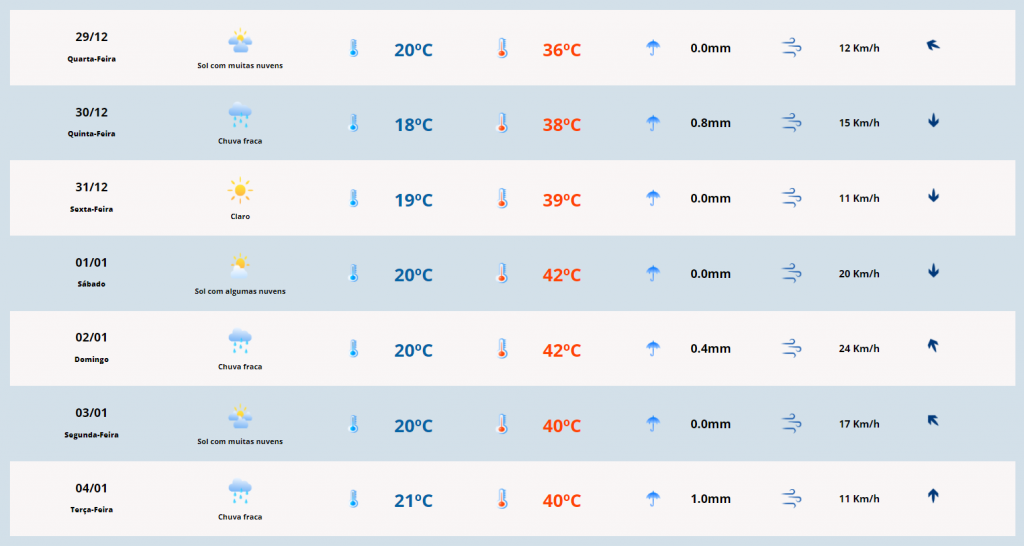 Para sexta-feira, 31, o último dia do ano, a previsão é de que os termômetros fiquem em torno dos 39 graus. Sem expectativa de chuva ao longo de todo o dia, na hora da virada, as condições climáticas devem ser ótimas para aproveitar o Réveillon.