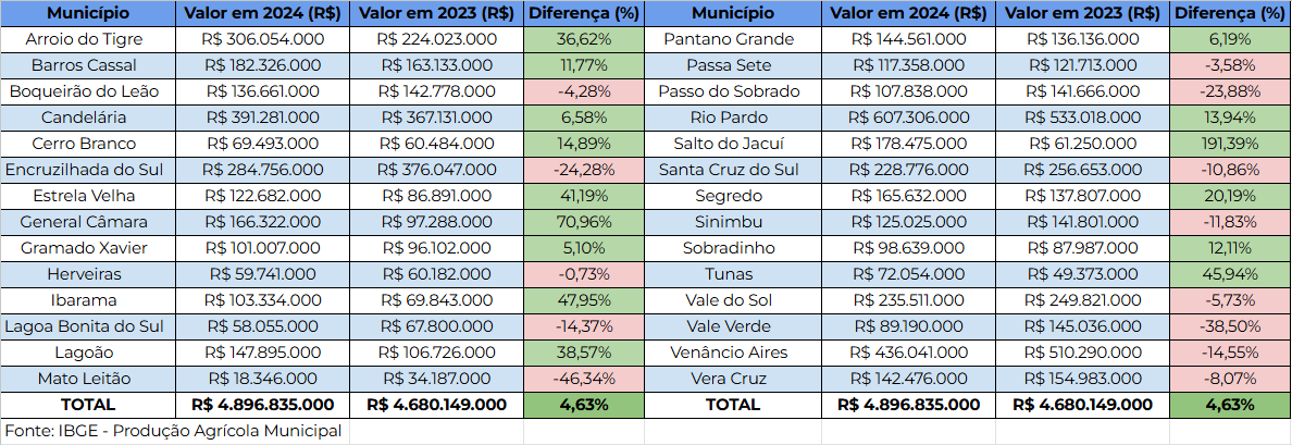 Ao comparar os resultados de 2024 e 2023, 15 municípios da região tiveram crescimento. O maior aumento foi em Salto do Jacuí: o valor da produção disparou de R$ 61,3 milhões para R$ 178,5 milhões, uma diferença de 191,39%. Também se destacaram General Câmara, com de 70,96%; Ibarama, com 47,95%, e Tunas, com 45,94%. No entanto, a colheita do ano passado teve redução em 13 cidades, sendo Mato Leitão (-46,34%), Vale Verde (-38,5%) e Encruzilhada do Sul (-24,28%) as mais prejudicadas.