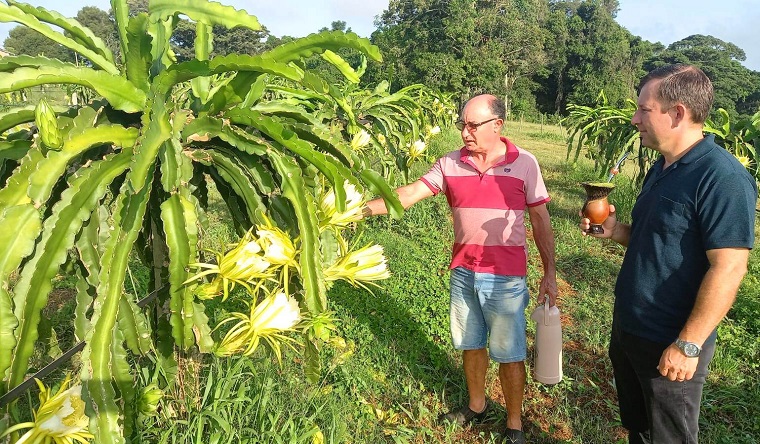 A propriedade de Waldir Carvalho, em Dourados, no município de Vale Verde, iniciou a colheita da pitaya. O produtor foi o primeiro a investir nesse segmento no município e possui uma área de 1,3 hectare, com 2 mil pés plantados das espécies Costa Rica e branca híbrida. O prefeito Carlos Gustavo Schuch visitou a área na terça-feira, 6, e verificou como acontece o processo de floração e polinização da fruta.