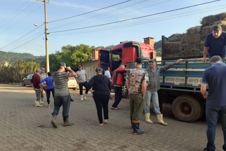 Produtores rurais de Sinimbu foram contemplados com doação de feno. O material foi encaminhado pelo Sindicato dos Trabalhadores Agricultores Familiares de Santo Angelo, com entrega articulada pela unidade de Sinimbu da mesma entidade. A Emater apoiou a ação.