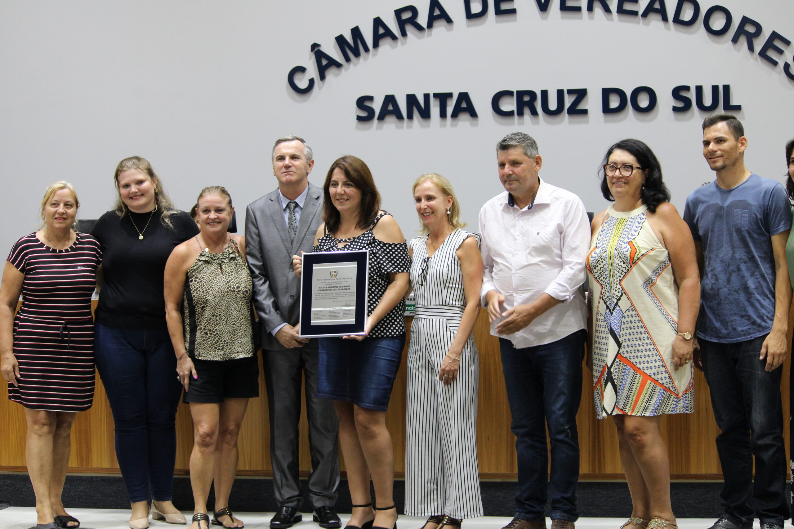 Uma sessão solene em homenagem à professora Betânia Mahl e à EMEF Luiz Schroeder foi realizada no final da tarde desta segunda-feira, 17, pela Câmara de Vereadores de Santa Cruz do Sul. A proposição foi do vereador Ari Thessing (PT). O objetivo foi reconhecer o trabalho realizado com o projeto “Expoagro Afubra – Agricultura e meio ambiente”, da EMEF Luiz Schroeder, que resultou na conquista do prêmio Fala, Professor!, no final de 2019.
