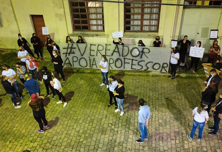 Um grupo de 70 professores esteve na frente da Câmara de Vereadores de Sinimbu na noite da última terça-feira, 20, para protestar, pela terceira sessão seguida, contra o projeto de lei 009/E/2021, que revisa o plano de carreira dos professores da rede municipal.